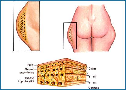 Gli accumuli localizzati di grasso corporeo, resistenti alla dieta e alla ginnastica, possono essere eliminati definitivamente mediante la LIPOSCULTURA, tecnica di rimodellamento corporeo a cielo coperto. La LIPOSCULTURA è una tecnica destinata alle adiposità localizzate e non al sovrappeso: non può essere valutata perciò in termini di peso in quanto non ne comporta la diminuzione. La LIPOSCULTURA può essere effettuata su qualsiasi area, ma le zone dove viene praticata più frequentemente sono i fianchi, le cosce, le ginocchia, l'addome, la regione sottomentoniera. La quantità di grasso asportabile è limitata e determinata di volta in volta dal medico, in base alle caratteristiche del singolo paziente. L'intervento è ripetibile. All'intervento residuano cicatrici cutanee di minima estensione (pochi millimetri), collocate in corrispondenza di solchi cutanei naturali e perciò destinate a diventare poco visibili. Eventuali smagliature o irregolarità sottocutanee non saranno corrette. Il tipo di anestesia, i tempi di degenza, la frequenza e il tipo di medicazioni, l'epoca della rimozione dei punti, dipendono dal singolo caso clinico e dalla tecnica impiegata. Il risultato, pur apprezzabile fin dai primi tempi, si evidenzia in non meno di due mesi ed è destinato a migliorare ulteriormente. L'intervento chirurgico generalmente ha una durata di circa 1 ora e può essere eseguito in anestesia locale con o senza sedazione. I pazienti non hanno particolare fastidio nel post-operatorio. Generalmente 48 ore dopo l'intervento il paziente può riprendere l'attività lavorativa e può tornare alla completa normalità in circa 7 giorni.